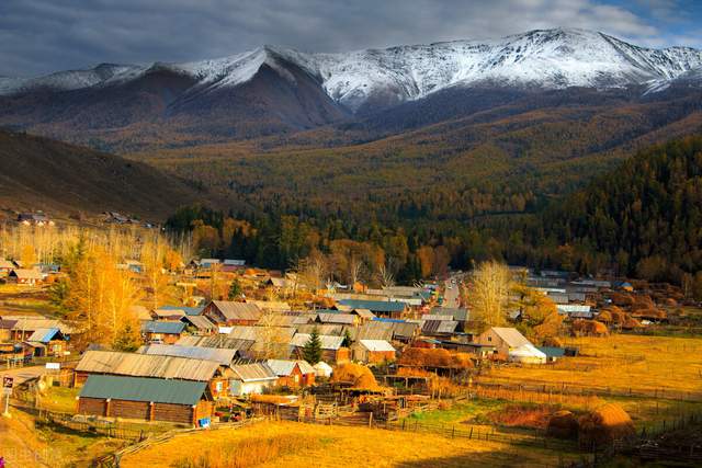 村子里的房屋,大多是樸素的木頭房,分布在溝谷底,金黃色的樺樹和楊樹點(diǎn)綴,還有兩條清澈的小河環(huán)村流過。