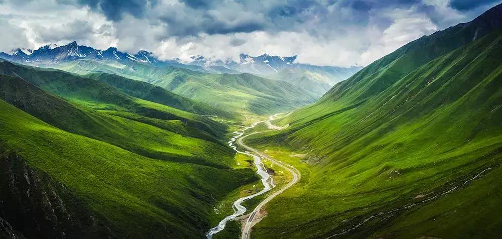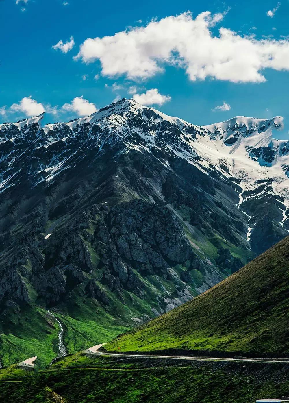 新疆獨庫公路蜿蜒在天山山脈的草原山谷中