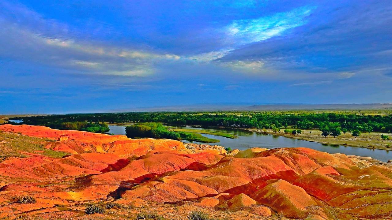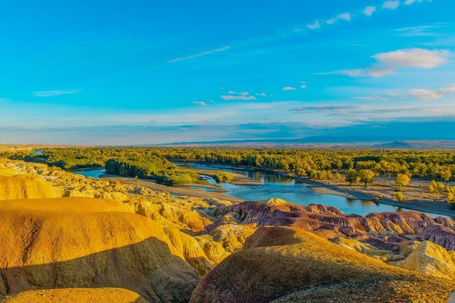 它毗鄰碧波蕩漾的額爾齊斯河,與對(duì)岸蔥郁青翠的河谷風(fēng)光遙相輝映,可謂“一河隔兩岸,自有兩重天”。激猛的河流沖擊以及狂風(fēng)侵蝕,形成了北岸的懸崖式雅丹地貌,河岸巖層抗風(fēng)化能力強(qiáng)弱不一,輪廓便會(huì)參差不齊,而巖石含有礦物質(zhì)的不同,又幻化出種種異彩,因此得名“五彩灘”。而南岸卻是綠樹(shù)葳蕤,連綿成林,遠(yuǎn)處逶迤的山巒與戈壁風(fēng)光盡收眼底。