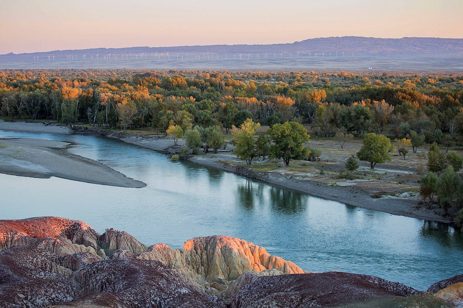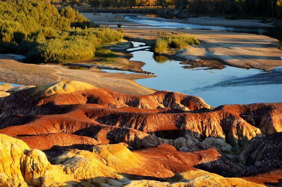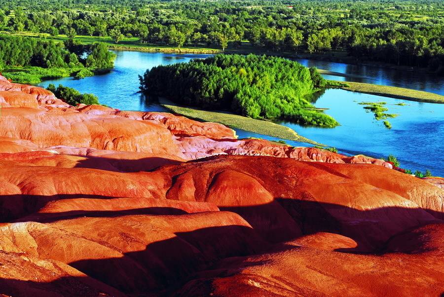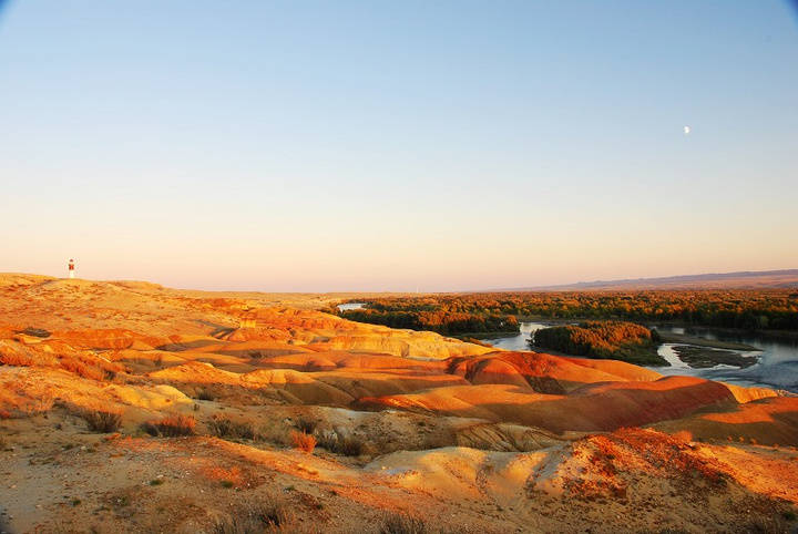 五彩灘的特別,還由于它色彩絢爛,形狀繽紛。因?yàn)檫@里有侏羅紀(jì)時(shí)代的煤層,經(jīng)過(guò)千萬(wàn)年風(fēng)蝕雨剝以及河水的沖刷,在幾乎寸草不生的河灘上出現(xiàn)了紅、綠、紫、黃、棕等鮮艷的色彩。在河水的映襯和夕陽(yáng)的照射下,當(dāng)你走進(jìn)這高低起伏的“ 丘陵 ”地帶,就如同走進(jìn)一個(gè)五彩斑斕夢(mèng)幻般的世界,那些光怪陸離的色彩從四面八方撲面而來(lái),都是那么明快、那么強(qiáng)烈、那么豐富多彩,真讓你感到目不暇接,眼花繚亂。