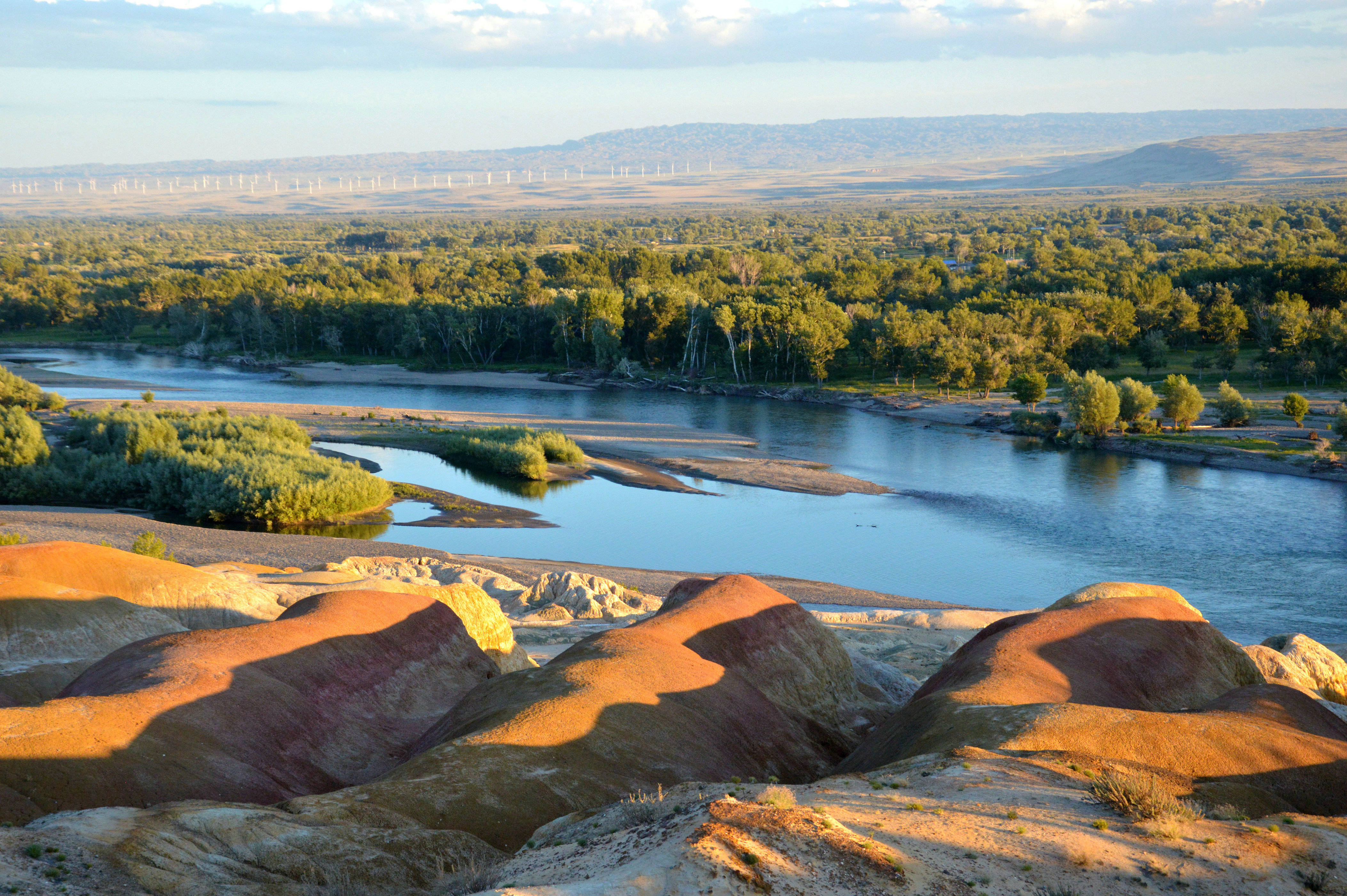 五彩灘風(fēng)景區(qū)前還有大型的風(fēng)力發(fā)電網(wǎng)站,給遼闊的視野里添加了一曲動(dòng)感活力的生命旋律。綠草如茵、山花爛漫、牛養(yǎng)成群、駿馬奔馳,綠洲與沙漠之間穿插著群群的駱駝,大場(chǎng)面的景觀更體現(xiàn)哈薩克牧民純情,樸實(shí)的牧民生活,讓您感受到一路春風(fēng)一路歌聲。