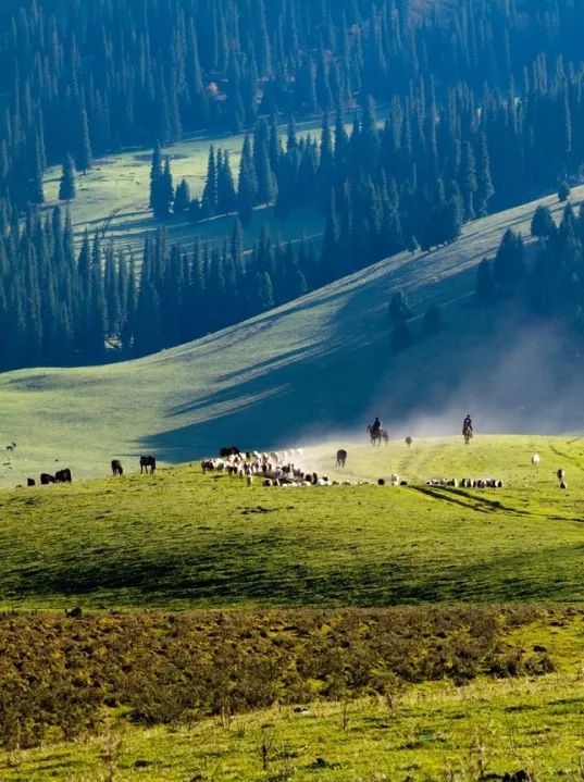 那拉提河谷草原為春秋牧場,空中草原為夏牧場。根據(jù)季節(jié)變化, 哈薩克牧民一般以阿吾勒為單位,每年進(jìn)行轉(zhuǎn)場。