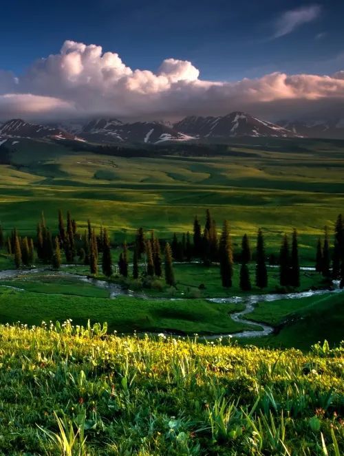 白雪皚皚的山峰、茂密的森林、連綿起伏的山丘、平坦的草甸,蜿蜒的溪流,那拉提草高花旺,碧茵似錦,非常美麗,是世界最美河谷草原之一,歷史上的那拉提草原有鹿苑之稱。