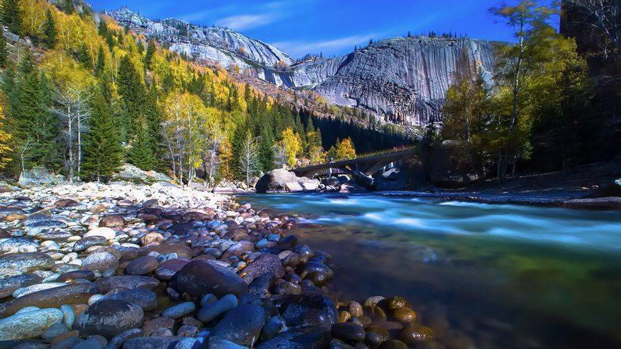 山間金黃的白樺樹、蔥綠的針葉樹在藍(lán)天白云的映照下,層層疊疊,色彩斑斕,是金秋喀納斯一幅雋永的油畫。